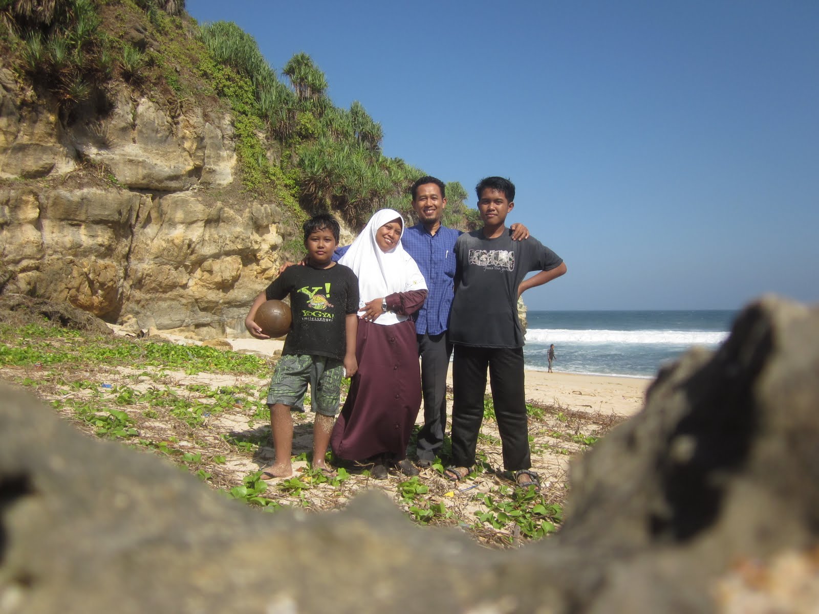 Tanggal 4 September, 2011 tepatnya hari ahad . Ibrohim dan Habib merengek, katanya mereka belum jalan-jalan setelah Idul Fitri. Awalnya saya tidak punya rencana untuk bepergian pada hari tersebut karena sudah lima hari (mulai tgl 30 Agustus sampai tgl 3 September) bersilaturrahim ke rumah orang tua dan saudara. Setelah berdiskusi dengan istri, kita putuskan untuk pergi ke pantai. Padahal semua anggota keluarga masih puasa syawal (puasa yang dilaksanakan 6 hari pada bulan syawal sebagai pelengkap puasa ramadhan). Karena sudah disepakati, kitapun memutuskan pantai mana yang paling mudah dicapai. Waktu itu jam 10.00 pagi. Ke teleng Ria? pasti disana ramai sekali karena hari itu pasti ada acara syawalan. Ke Parangtritis? Perjalanannya terlalu menyita waktu karena bertepatan dengan arus balik. Lagipula disana pasti sangat ramai. Meskipun jalan Solo jogja lebar, tetapi pada setiap traffic light mesti terjadi penumpukan kendaraan. Ke pantai utara? terlalu jauh dan pemandangannya kurang bagus. Akhirnya kami putuskan untuk pergi ke pantai nampu. Pantai Nampu terletak di kecamatan Paranggupito, Wonogiri. Dari Solo kita berangkat pada pukul 10.00. Carry silver keluaran tahun 86 ini kupacu kearah selatan. Alhamdulillah kendaraan yang lumayan tua tersebut masih sehat dan bisa digunakan untuk perjalanan jauh. Kami melewati Sukoharjo, Nguter, Selogiri, Pabrik Air Mancur belok kanan menuju kota wonogiri. Sampai di wonogiri jam 11.00. Perjalanan berlanjut melalui Wadhuk gajah Mungkur, Wuryantoro, Eromoko, dan Pracimantoro. Sesampai di perempatan Pracimantoro kami belok ke kiri menuju arah Pacitan/Baturetno. Jam 11.45 kami sampai di giribelah. Di perempatan Giribelah kami belok kanan melalui jalan yang naik turun dan berkelok-kelok menuju ke Paranggupito. Pada jam 12.15 sampailah kami di pantai Nampu.